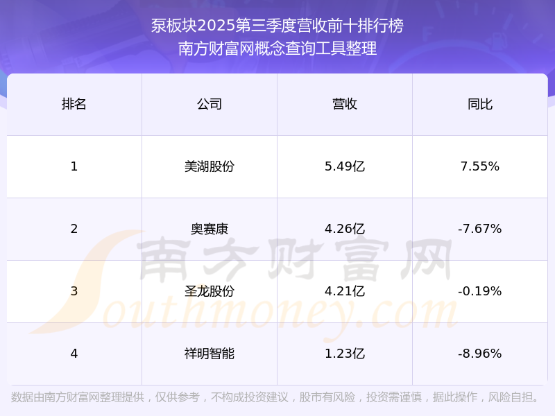 按照南方財富網(wǎng)概念查詢工具統(tǒng)計,該股所屬板塊為泵板塊,該板塊共有4只股票,君禾股份2025第三季度營收在該板塊中排名為第4名,該板塊2025第三季度營收排名前十的股票如下表: