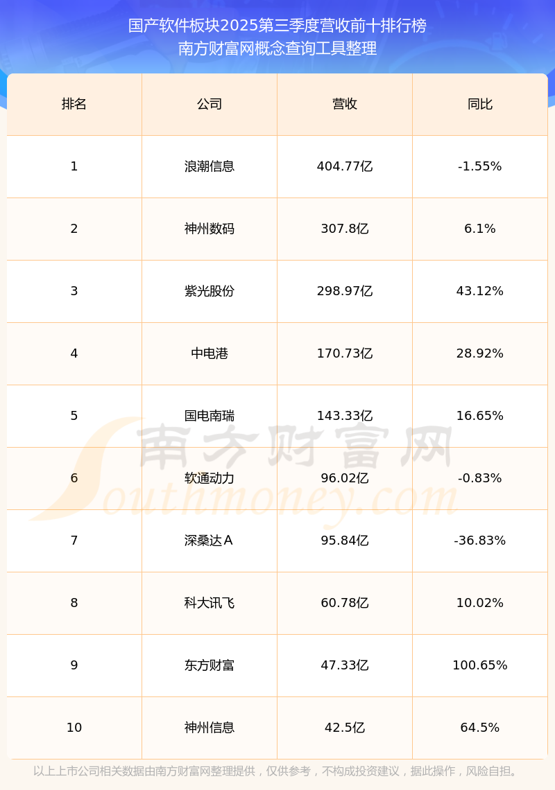 按照南方財富網概念查詢工具統(tǒng)計,該股所屬板塊為國產軟件板塊,該板塊共有358只股票,復旦復華2025第三季度營收在該板塊中排名為第207名,該板塊2025第三季度營收排名前十的股票如下表: