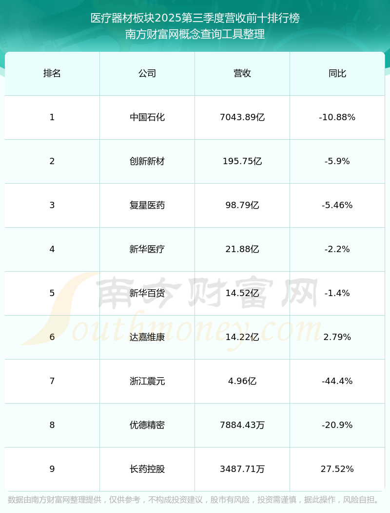 按照南方財(cái)富網(wǎng)概念查詢工具統(tǒng)計(jì),該股所屬板塊為醫(yī)療器材板塊,該板塊共有9只股票,心脈醫(yī)療2025第三季度營收在該板塊中排名為第9名,該板塊2025第三季度營收排名前十的股票如下表:
