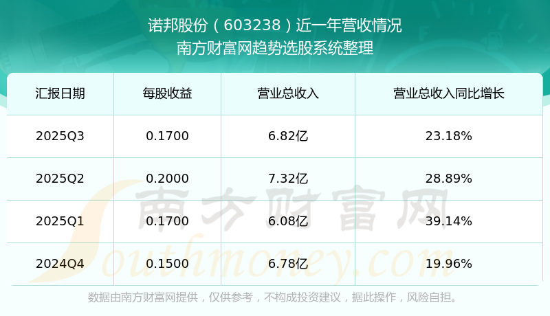 諾邦股份2025年第三季度顯示,公司主營收入6.82億元,同比23.18%;歸母凈利潤3060.65萬元,同比20.92%;扣非凈利潤3168.87萬元,同比35.43%。