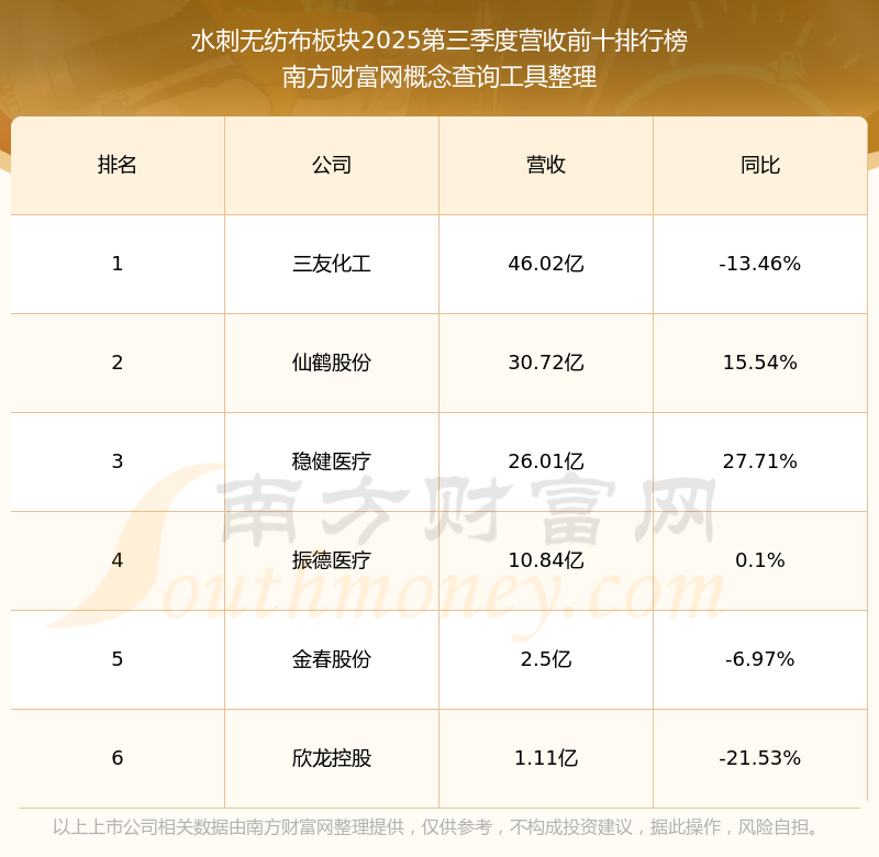 按照南方財富網(wǎng)概念查詢工具統(tǒng)計,該股所屬板塊為水刺無紡布板塊,該板塊共有6只股票,諾邦股份2025第三季度營收在該板塊中排名為第6名,該板塊2025第三季度營收排名前十的股票如下表:
