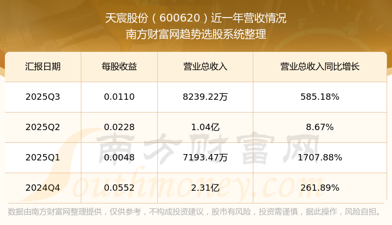 天宸股份2025年第三季度公司實現(xiàn)營業(yè)收入8239.22萬元,同比585.18%;歸母凈利潤752.33萬元,同比222.97%。