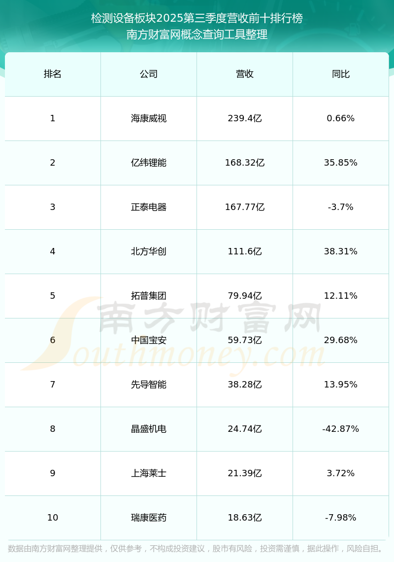 按照南方財富網(wǎng)概念查詢工具統(tǒng)計,該股所屬板塊為檢測設備板塊,該板塊共有48只股票,中科飛測2025第三季度營收在該板塊中排名為第24名,該板塊2025第三季度營收排名前十的股票如下表: