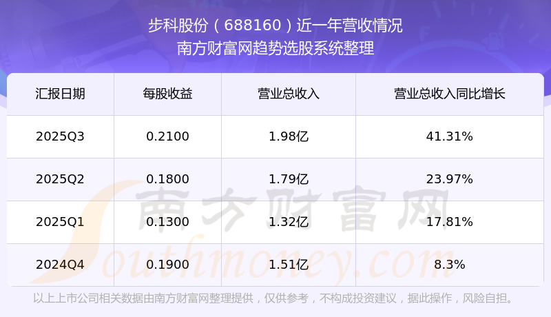 步科股份2025年第三季度顯示,公司主營收入1.98億元,同比41.31%;歸母凈利潤1841.85萬元,同比96.22%;扣非凈利潤1532.31萬元,同比120.18%。