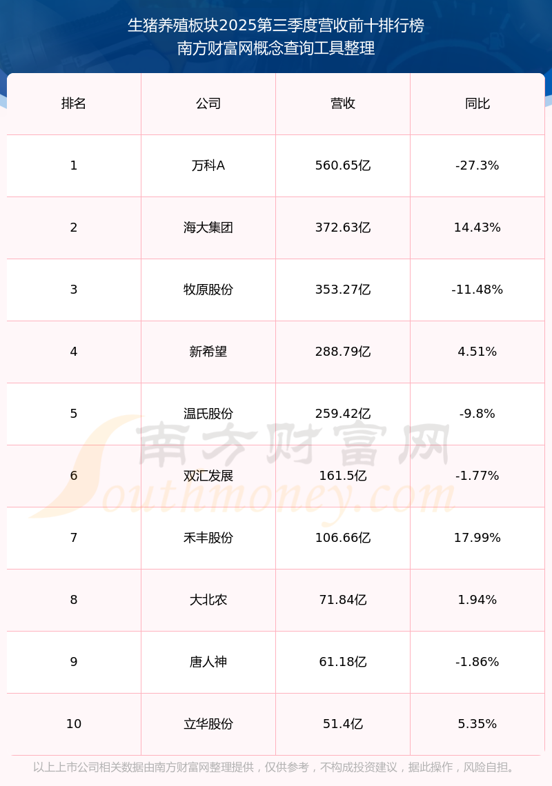 按照南方財(cái)富網(wǎng)概念查詢工具統(tǒng)計(jì),該股所屬板塊為生豬養(yǎng)殖板塊,該板塊共有33只股票,光明肉業(yè)2025第三季度營(yíng)收在該板塊中排名為第11名,該板塊2025第三季度營(yíng)收排名前十的股票如下表: