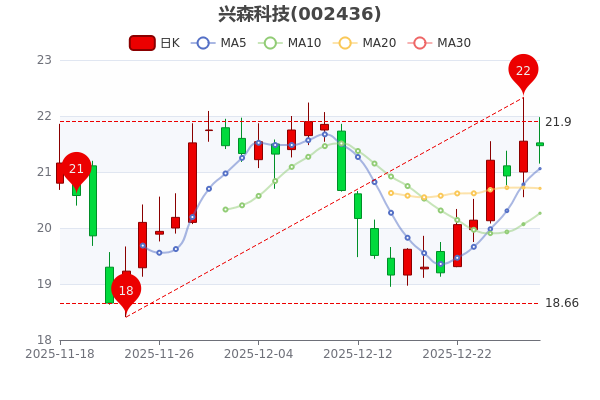 12月29日,興森科技開盤報21.52元,截至09時56分,該股跌0.37%,報價為21.460元,當日最高價為21.98元。換手率2.29%,市盈率為-178.83,7日內股價上漲8.96%。