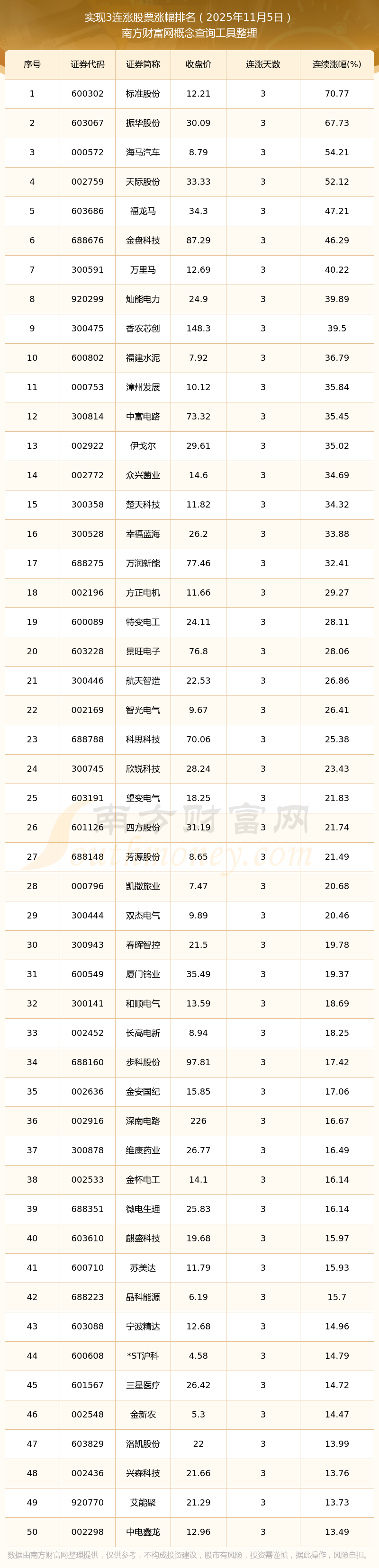 2025年11月5日實(shí)現(xiàn)3連漲股票漲幅排名