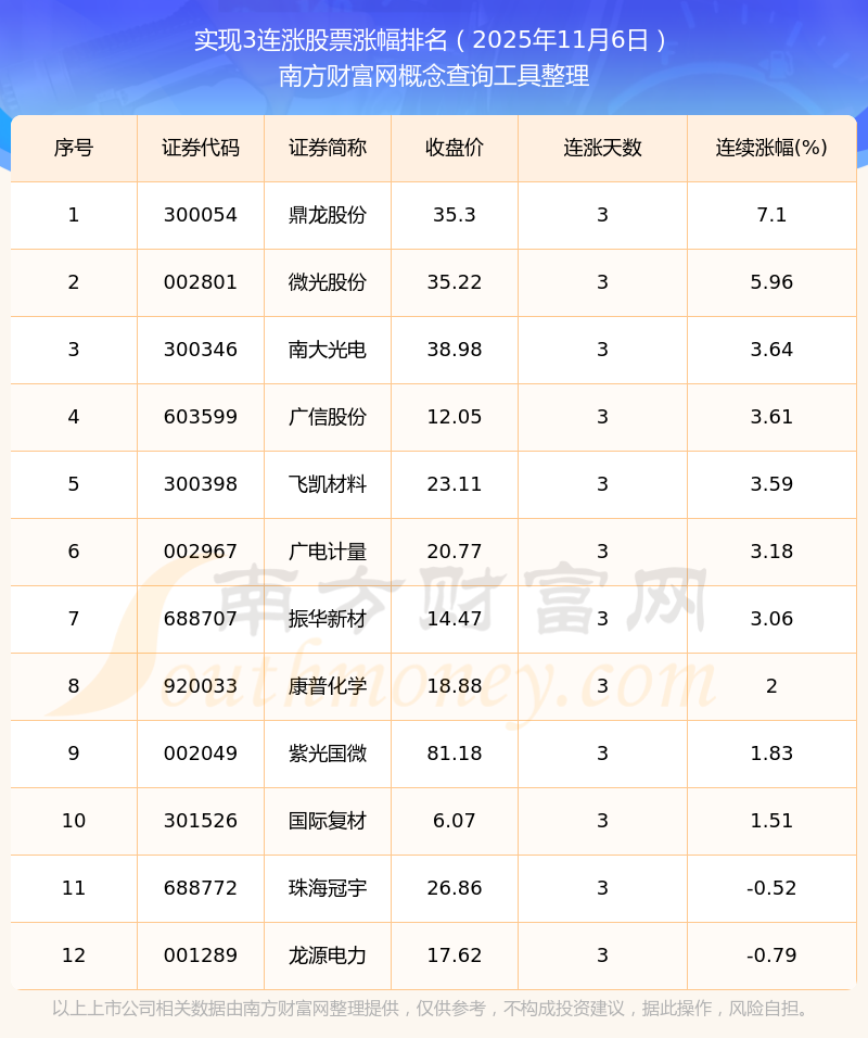 2025年11月6日實(shí)現(xiàn)3連漲股票漲幅排名