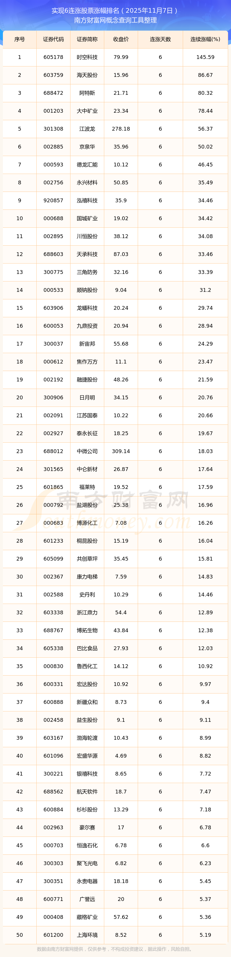 2025年11月7日實(shí)現(xiàn)6連漲股票漲幅排名