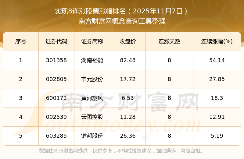 2025年11月7日實現(xiàn)8連漲股票漲幅排名