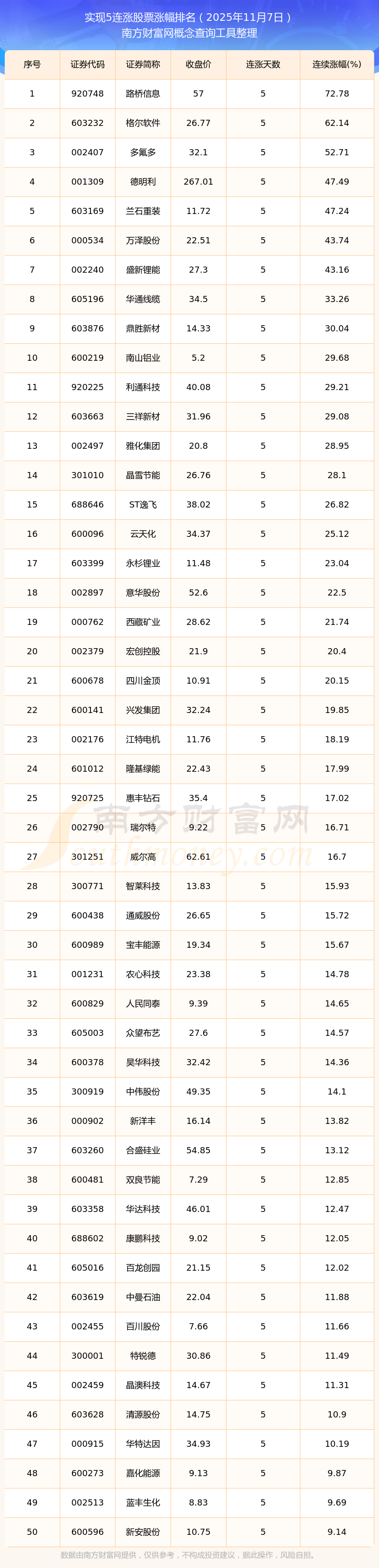 根據(jù)南方財(cái)富網(wǎng)概念查詢工具數(shù)據(jù)統(tǒng)計(jì),截止2025年11月7日收盤,共有80只個(gè)股實(shí)現(xiàn)5天連漲。其中連續(xù)漲幅較大的個(gè)股有路橋信息、格爾軟件、多氟多等,連續(xù)漲幅分別為72.78%、62.14%、52.71%。 2025年11月7日實(shí)現(xiàn)5連漲股票漲幅排名 數(shù)據(jù)由南方財(cái)富網(wǎng)提供,僅供
