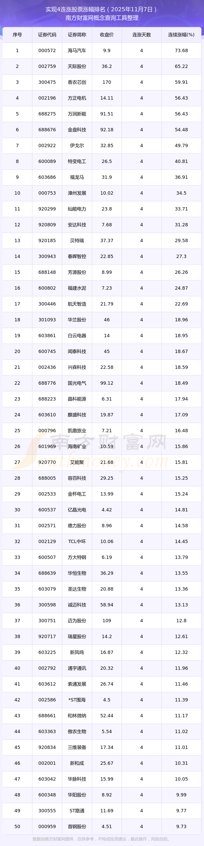 根據(jù)南方財(cái)富網(wǎng)概念查詢工具數(shù)據(jù)統(tǒng)計(jì),截止2025年11月7日收盤,共有122只個(gè)股實(shí)現(xiàn)4天連漲。其中連續(xù)漲幅較大的個(gè)股有海馬汽車、天際股份、香農(nóng)芯創(chuàng)等,連續(xù)漲幅分別為73.68%、65.22%、59.91%。