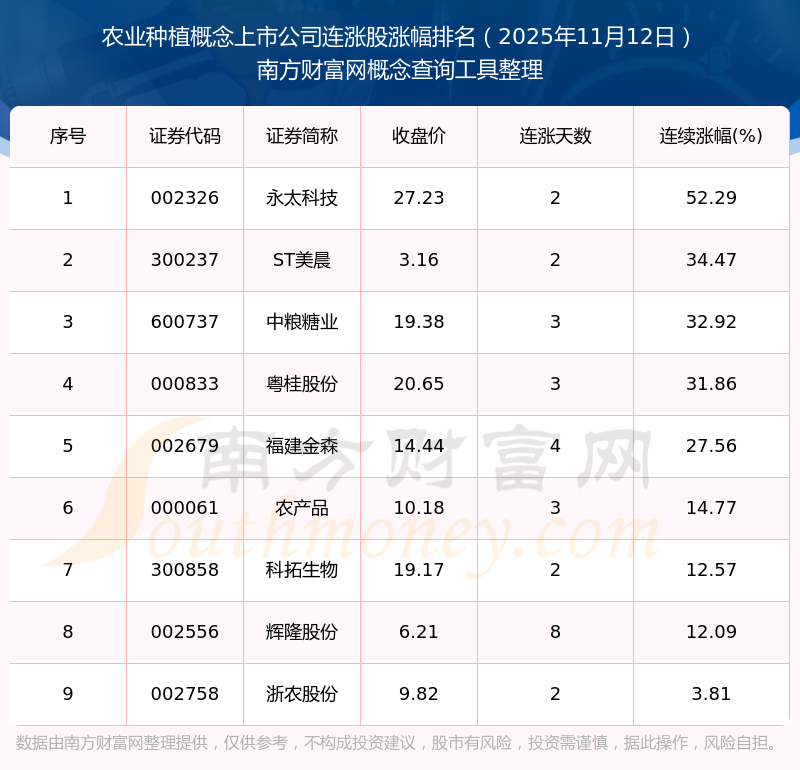 2025年11月12日農(nóng)業(yè)種植概念上市公司連漲股漲幅排名
