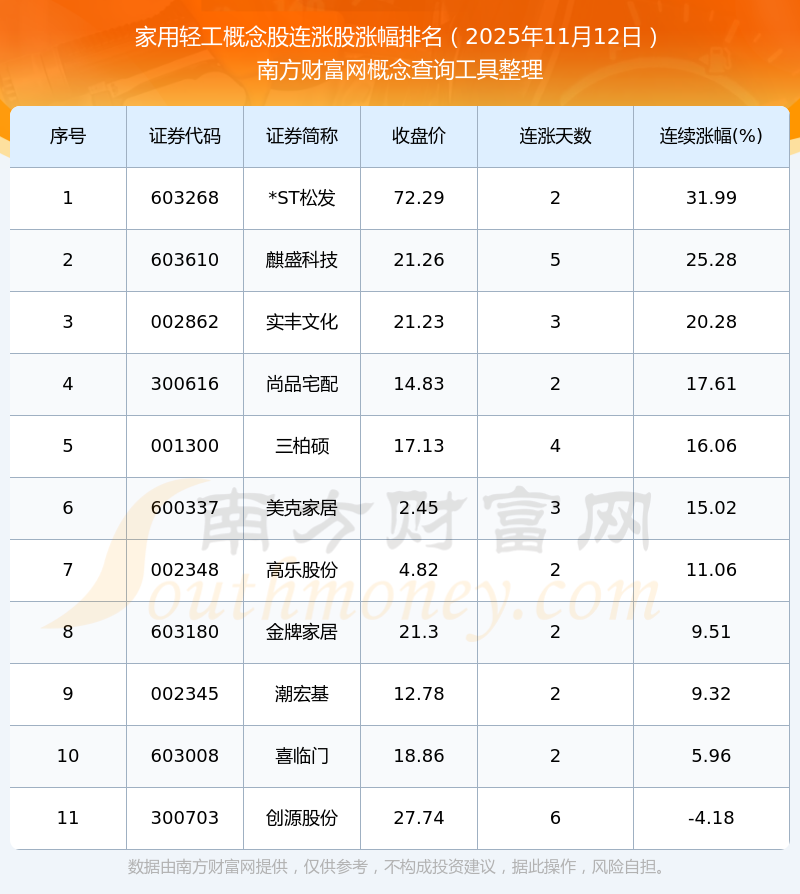 根據(jù)南方財富網(wǎng)概念查詢工具數(shù)據(jù)統(tǒng)計,截止2025年11月12日收盤,家用輕工概念股共有11只個股實現(xiàn)連漲。其中連續(xù)漲幅較大的個股有*ST松發(fā)、麒盛科技、實豐文化等,連續(xù)漲幅分別為31.99%、25.28%、20.28%。