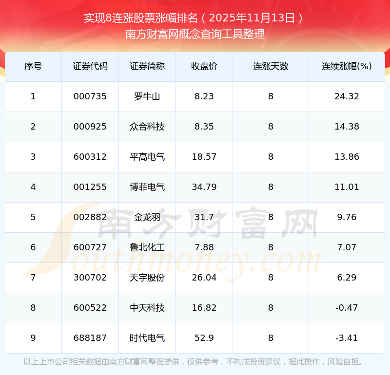 2025年11月13日實現(xiàn)8連漲股票漲幅排名