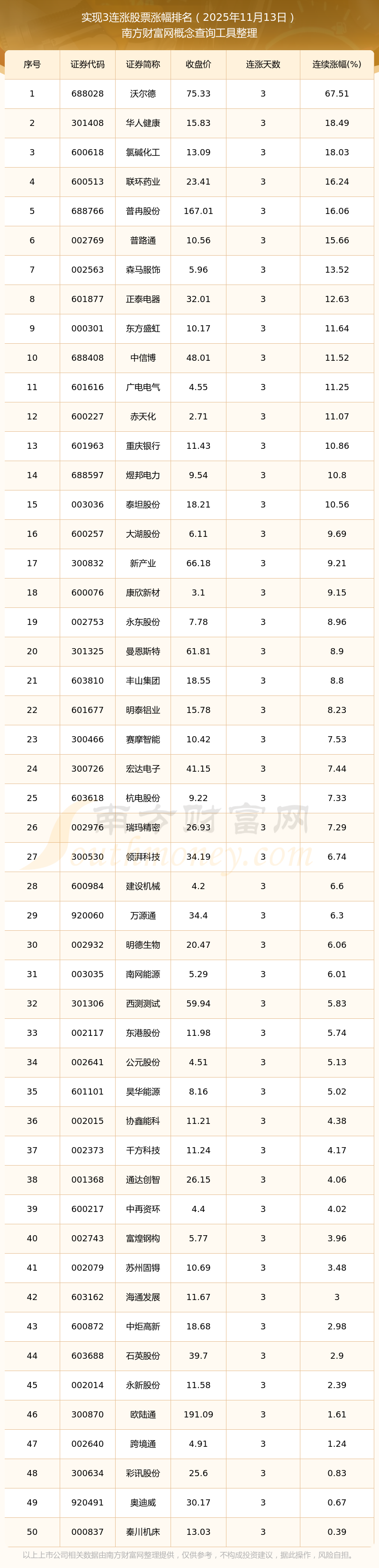 2025年11月13日實(shí)現(xiàn)3連漲股票漲幅排名