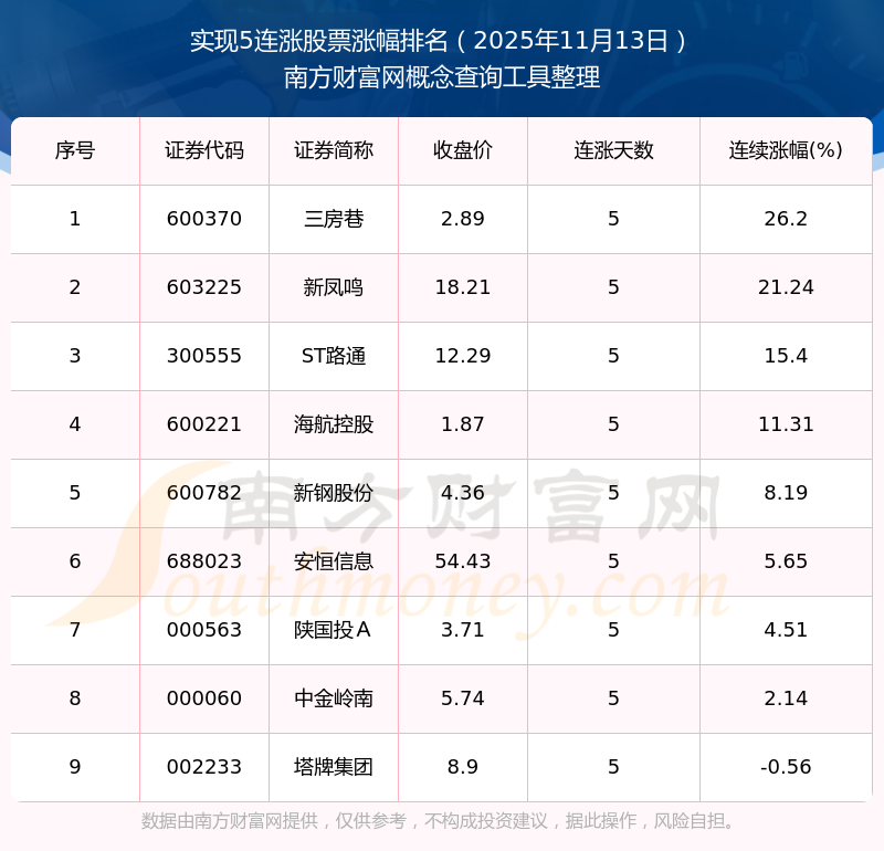 2025年11月13日實(shí)現(xiàn)5連漲股票漲幅排名