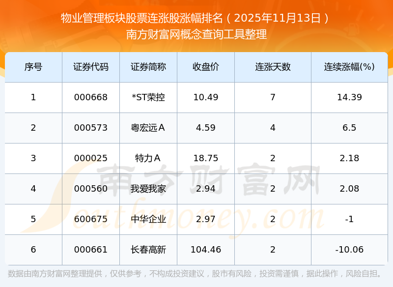2025年11月13日物業(yè)管理板塊股票連漲股漲幅排名