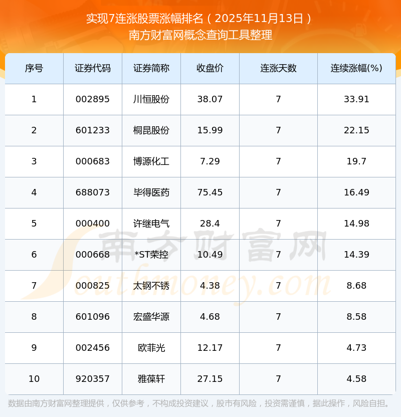 根據(jù)南方財富網(wǎng)概念查詢工具數(shù)據(jù)統(tǒng)計,截止2025年11月13日收盤,共有10只個股實現(xiàn)7天連漲。其中連續(xù)漲幅較大的個股有川恒股份、桐昆股份、博源化工等,連續(xù)漲幅分別為33.91%、22.15%、19.70%。