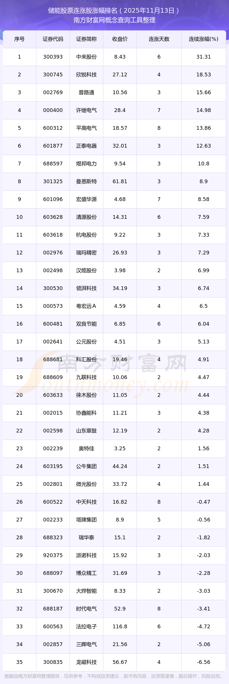 2025年11月13日儲(chǔ)能股票連漲股漲幅排名
