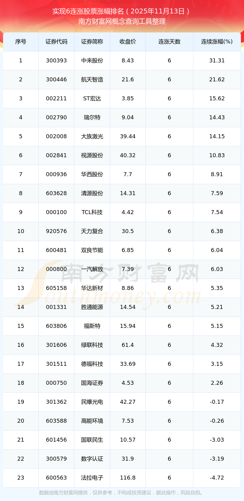 根據(jù)南方財富網(wǎng)概念查詢工具數(shù)據(jù)統(tǒng)計,截止2025年11月13日收盤,共有23只個股實現(xiàn)6天連漲。其中連續(xù)漲幅較大的個股有中來股份、航天智造、ST宏達等,連續(xù)漲幅分別為31.31%、21.62%、15.62%。