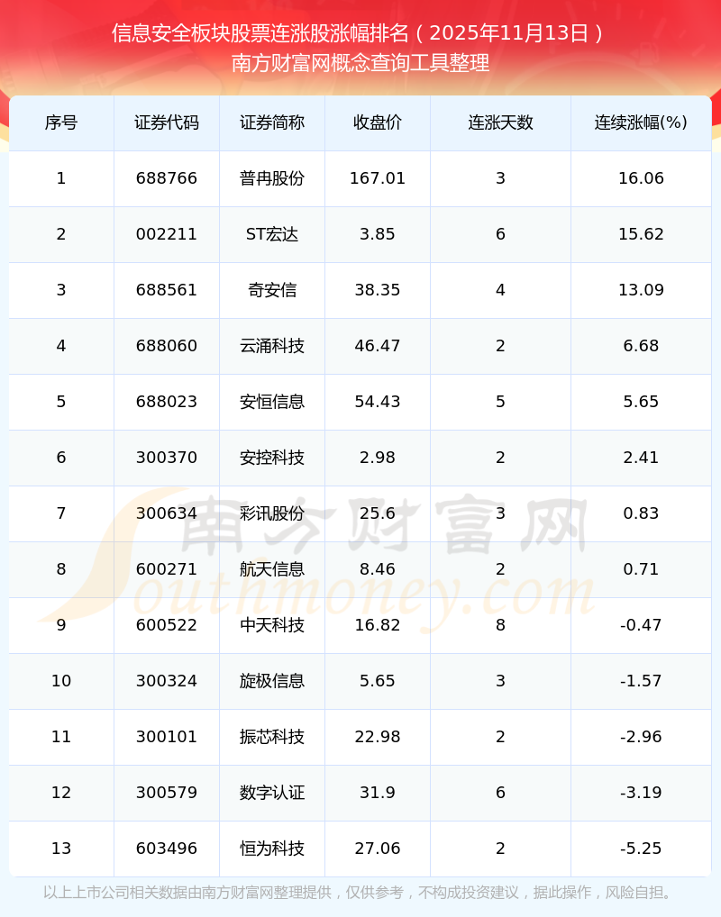 2025年11月13日信息安全板塊股票連漲股漲幅排名