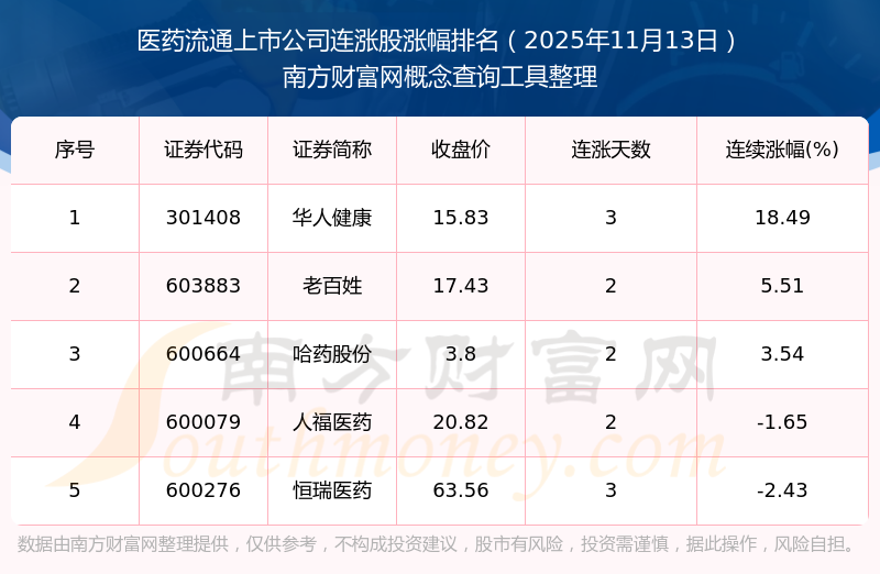 2025年11月13日醫(yī)藥流通上市公司連漲股漲幅排名
