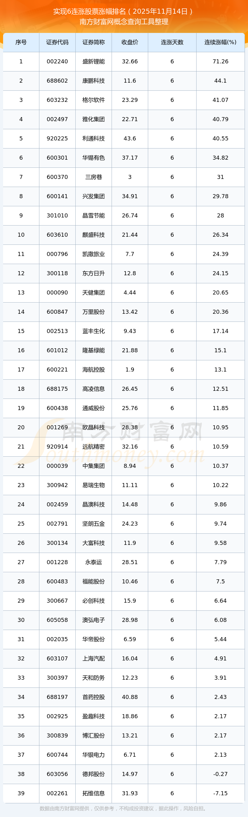根據(jù)南方財(cái)富網(wǎng)概念查詢工具數(shù)據(jù)統(tǒng)計(jì),截止2025年11月14日收盤,共有39只個(gè)股實(shí)現(xiàn)6天連漲。其中連續(xù)漲幅較大的個(gè)股有盛新鋰能、康鵬科技、格爾軟件等,連續(xù)漲幅分別為71.26%、44.10%、41.07%。