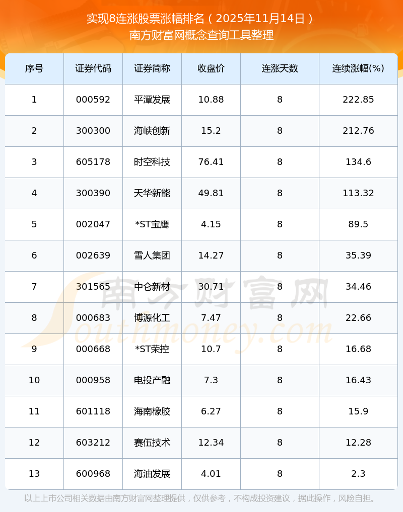 2025年11月14日實(shí)現(xiàn)8連漲股票漲幅排名