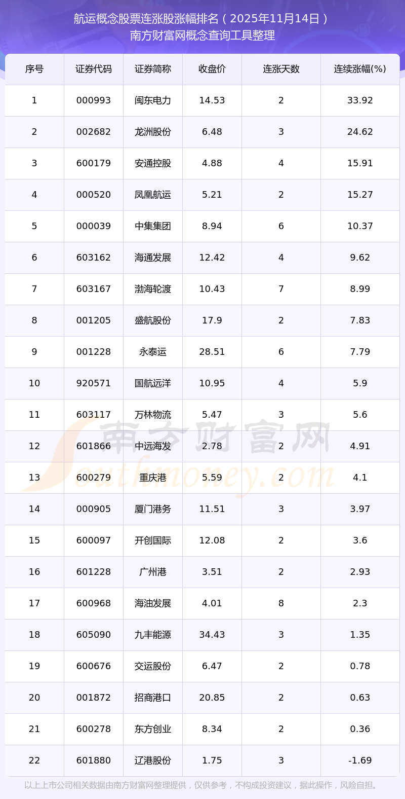 2025年11月14日航運概念股票連漲股漲幅排名