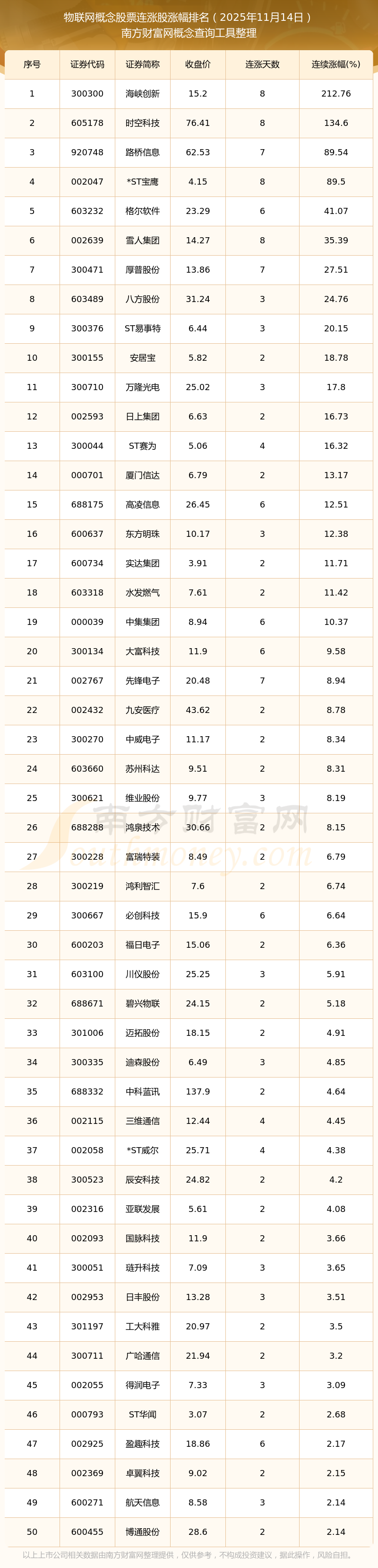 2025年11月14日物聯(lián)網(wǎng)概念股票連漲股漲幅排名
