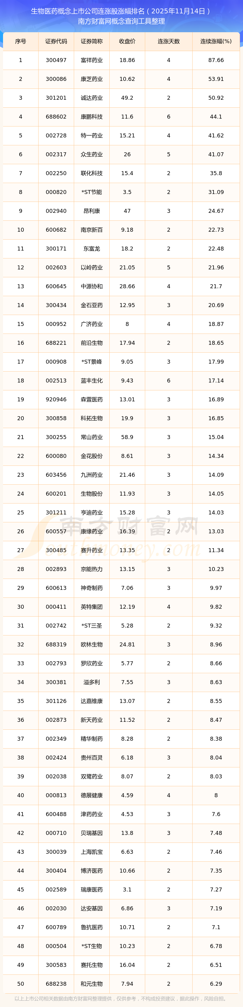 2025年11月14日生物醫(yī)藥概念上市公司連漲股漲幅排名