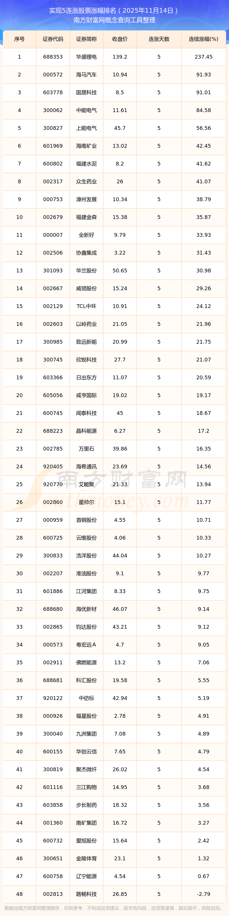 根據(jù)南方財富網(wǎng)概念查詢工具數(shù)據(jù)統(tǒng)計,截止2025年11月14日收盤,共有48只個股實現(xiàn)5天連漲。其中連續(xù)漲幅較大的個股有華盛鋰電、海馬汽車、國晟科技等,連續(xù)漲幅分別為237.45%、91.93%、91.01%。
