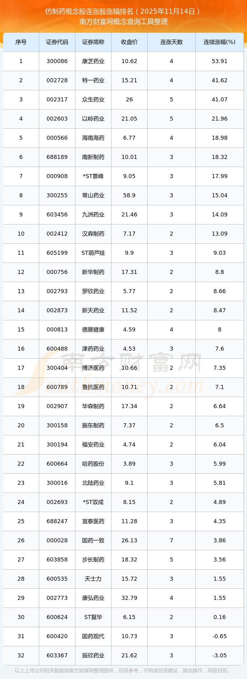 2025年11月14日仿制藥概念股連漲股票漲幅排名