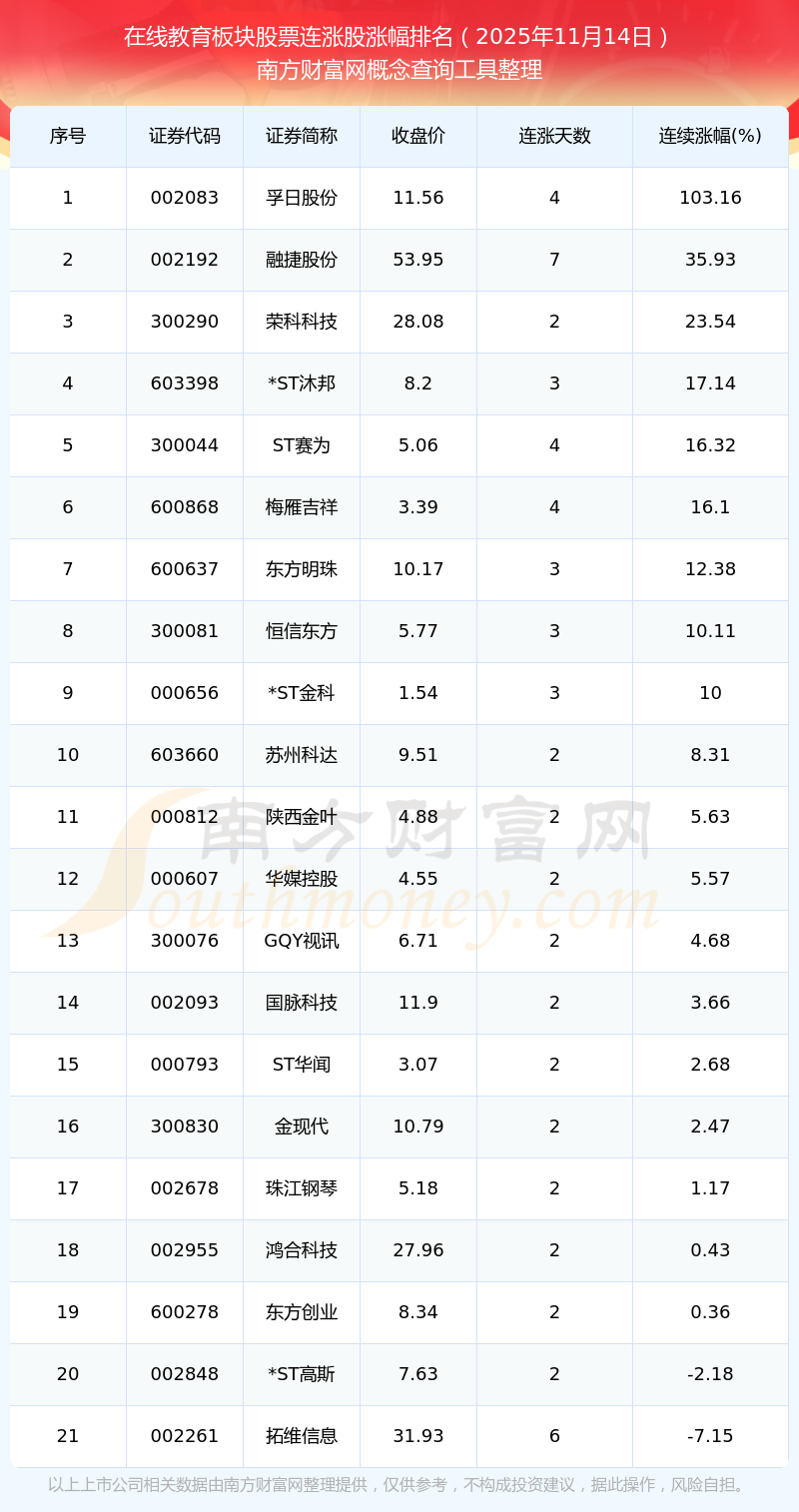 2025年11月14日在線教育板塊股票連漲股漲幅排名