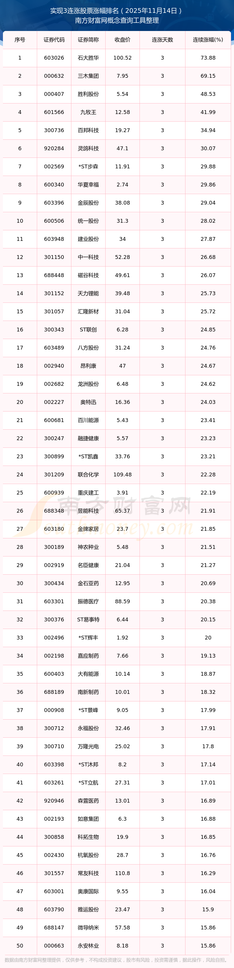 根據南方財富網概念查詢工具數據統計,截止2025年11月14日收盤,共有219只個股實現3天連漲。其中連續(xù)漲幅較大的個股有石大勝華、三木集團、勝利股份等,連續(xù)漲幅分別為73.88%、69.15%、48.53%。