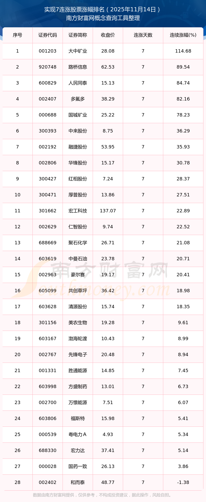 2025年11月14日實現(xiàn)7連漲股票漲幅排名