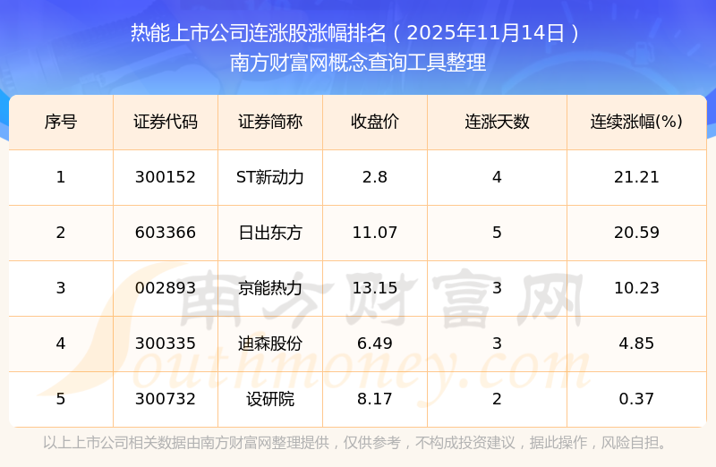 2025年11月14日熱能上市公司連漲股漲幅排名