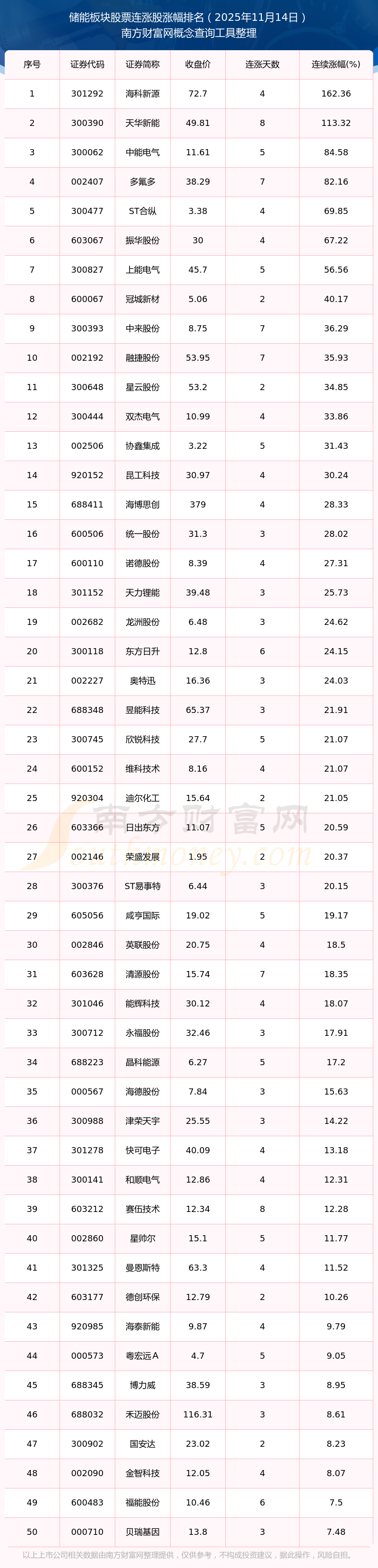 2025年11月14日儲(chǔ)能板塊股票連漲股漲幅排名