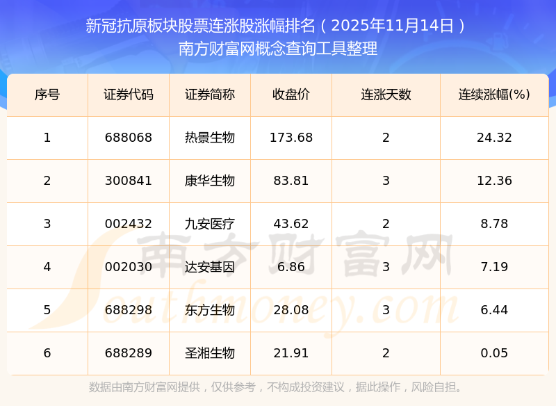 根據(jù)南方財(cái)富網(wǎng)概念查詢工具數(shù)據(jù)統(tǒng)計(jì),截止2025年11月14日收盤,新冠抗原板塊股票共有6只個(gè)股實(shí)現(xiàn)連漲。其中連續(xù)漲幅較大的個(gè)股有熱景生物、康華生物、九安醫(yī)療等,連續(xù)漲幅分別為24.32%、12.36%、8.78%。