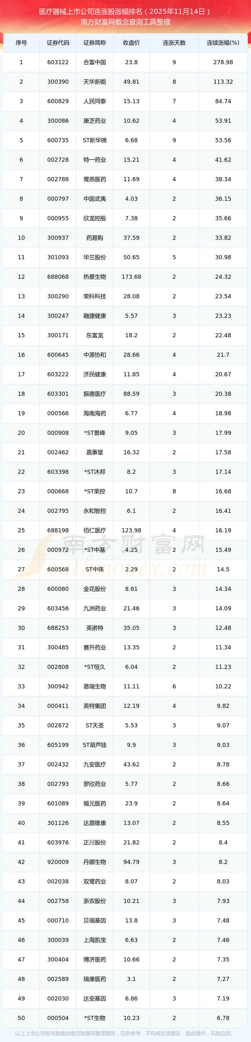 2025年11月14日醫(yī)療器械上市公司連漲股漲幅排名