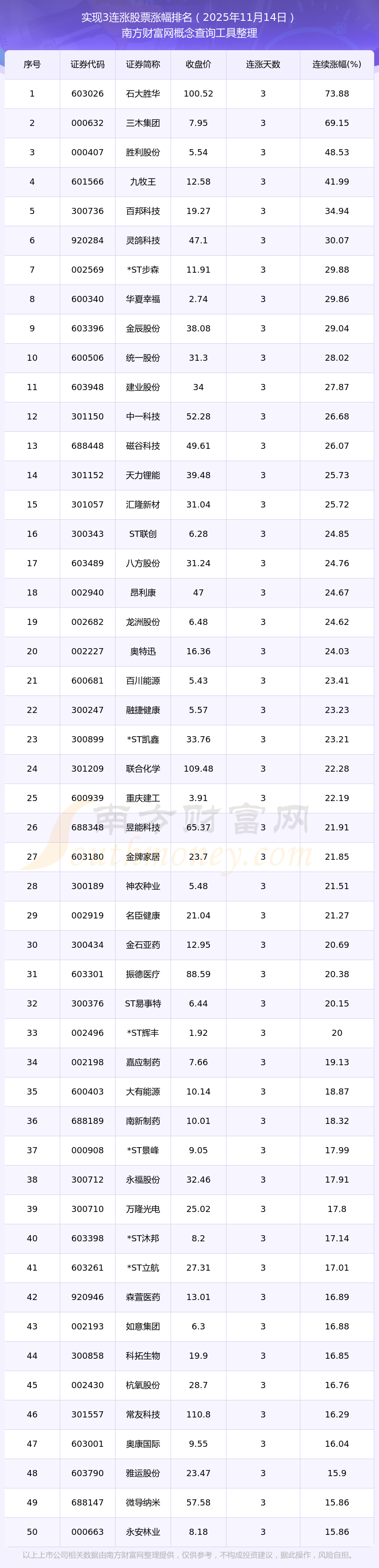 根據(jù)南方財富網(wǎng)概念查詢工具數(shù)據(jù)統(tǒng)計,截止2025年11月14日收盤,共有219只個股實現(xiàn)3天連漲。其中連續(xù)漲幅較大的個股有石大勝華、三木集團、勝利股份等,連續(xù)漲幅分別為73.88%、69.15%、48.53%。