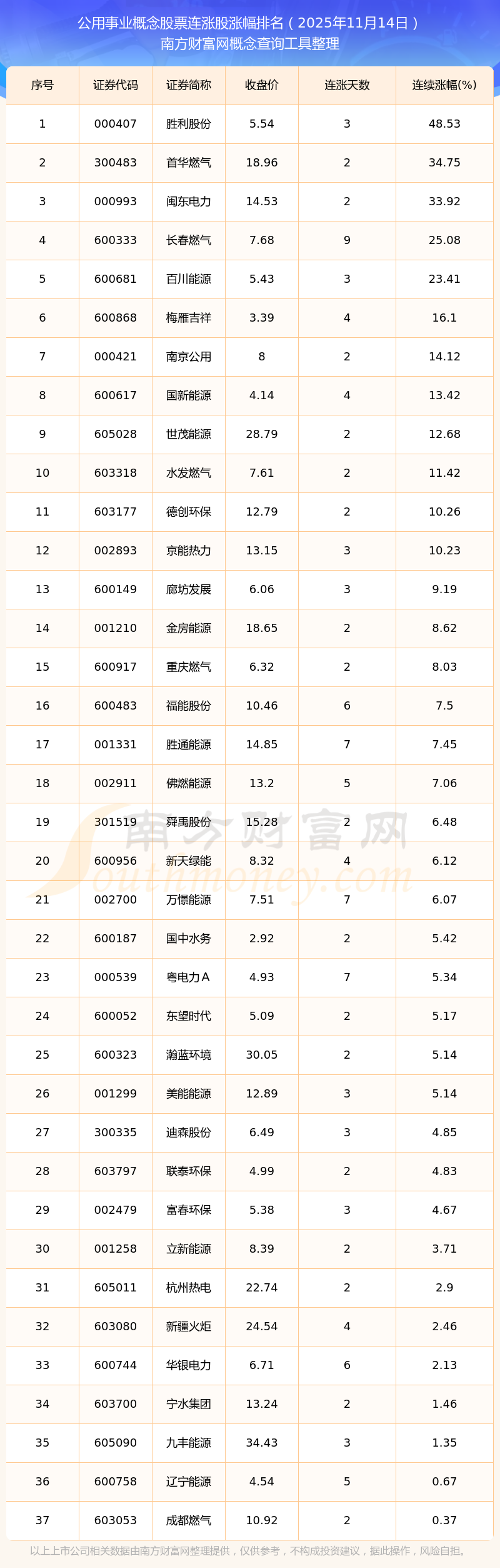 2025年11月14日公用事業(yè)概念股票連漲股漲幅排名
