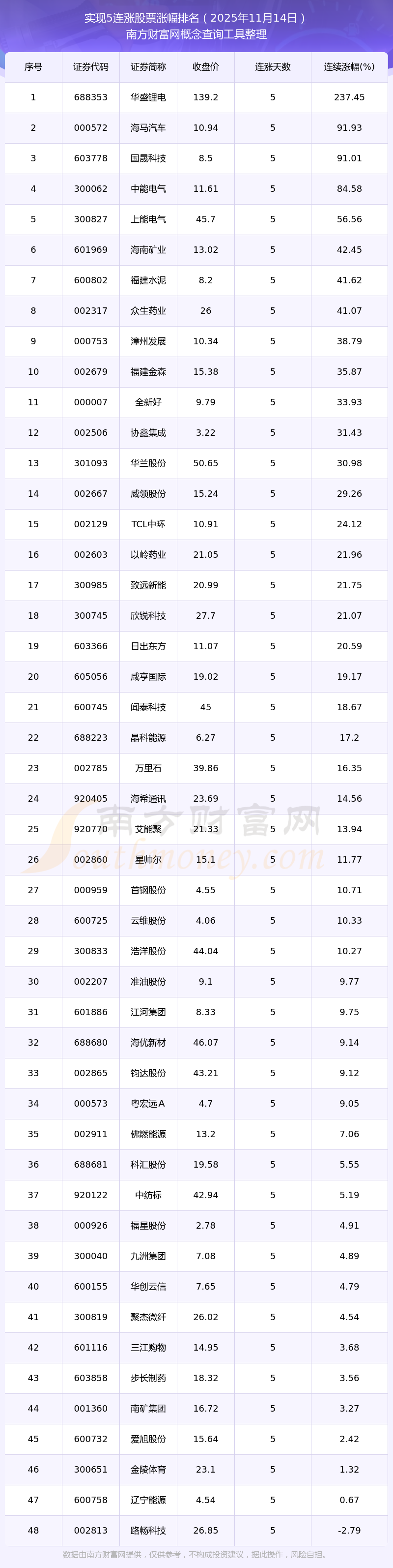 根據(jù)南方財(cái)富網(wǎng)概念查詢工具數(shù)據(jù)統(tǒng)計(jì),截止2025年11月14日收盤,共有48只個股實(shí)現(xiàn)5天連漲。其中連續(xù)漲幅較大的個股有華盛鋰電、海馬汽車、國晟科技等,連續(xù)漲幅分別為237.45%、91.93%、91.01%。