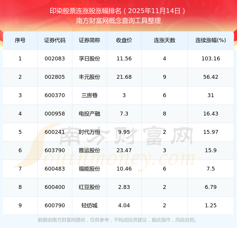 根據(jù)南方財(cái)富網(wǎng)概念查詢工具數(shù)據(jù)統(tǒng)計(jì),截止2025年11月14日收盤,印染股票共有9只個(gè)股實(shí)現(xiàn)連漲。其中連續(xù)漲幅較大的個(gè)股有孚日股份、豐元股份、三房巷等,連續(xù)漲幅分別為103.16%、56.42%、31.00%。