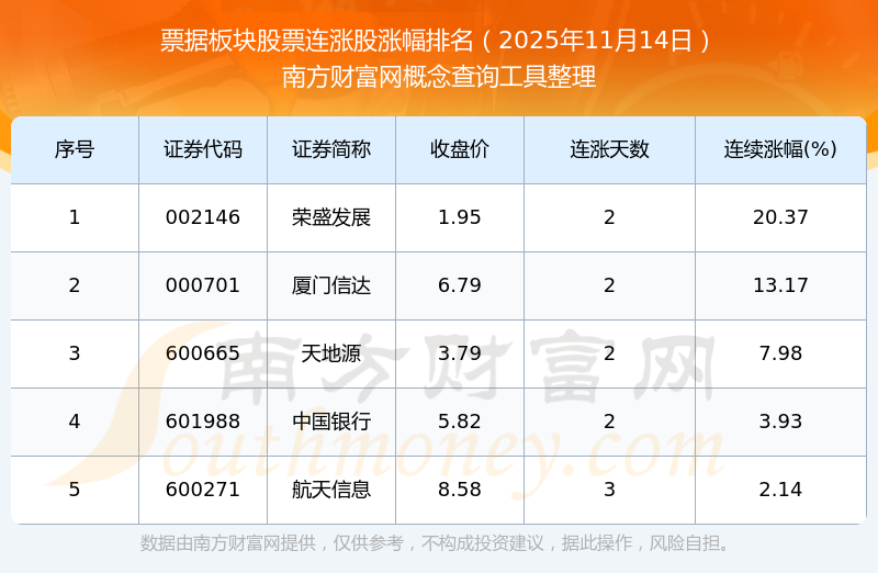 根據(jù)南方財富網(wǎng)概念查詢工具數(shù)據(jù)統(tǒng)計,截止2025年11月14日收盤,票據(jù)板塊股票共有5只個股實現(xiàn)連漲。其中連續(xù)漲幅較大的個股有榮盛發(fā)展、廈門信達、天地源等,連續(xù)漲幅分別為20.37%、13.17%、7.98%。