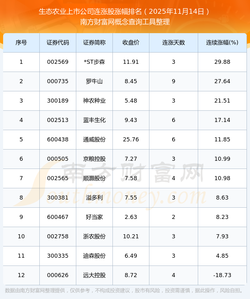 2025年11月14日生態(tài)農(nóng)業(yè)上市公司連漲股漲幅排名