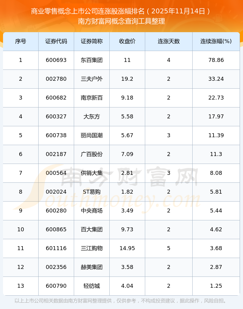 2025年11月14日商業(yè)零售概念上市公司連漲股漲幅排名