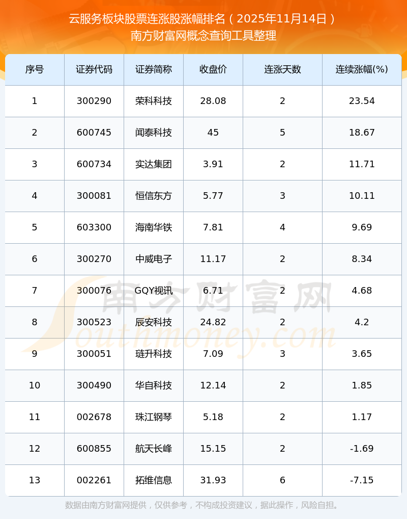 2025年11月14日云服務(wù)板塊股票連漲股漲幅排名