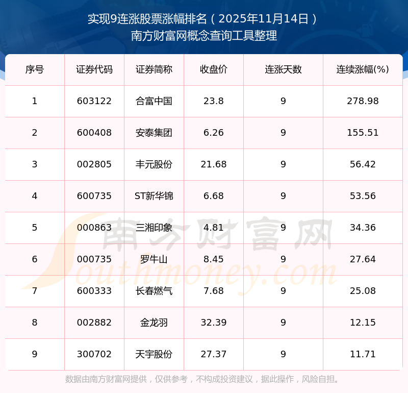 根據(jù)南方財富網(wǎng)概念查詢工具數(shù)據(jù)統(tǒng)計,截止2025年11月14日收盤,共有9只個股實現(xiàn)9天連漲。其中連續(xù)漲幅較大的個股有合富中國、安泰集團(tuán)、豐元股份等,連續(xù)漲幅分別為278.98%、155.51%、56.42%。